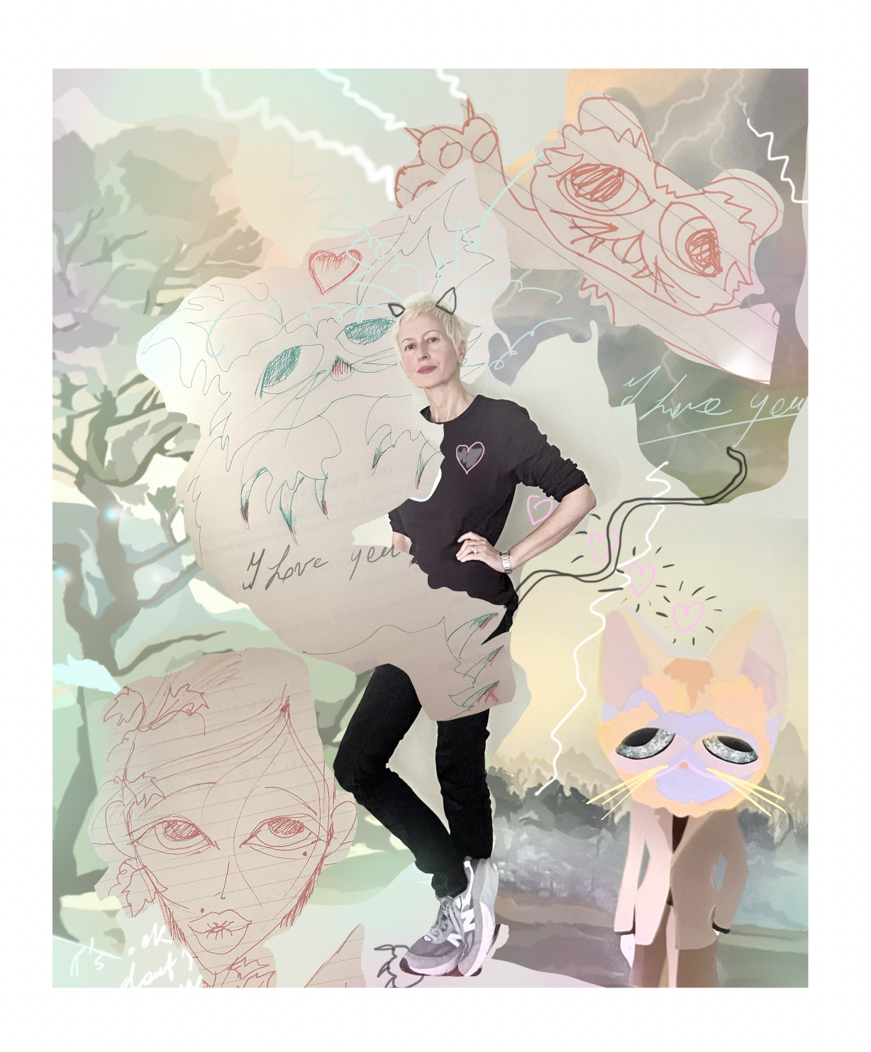 Her creative process begins with photographs captured in her everyday life, such as self portraits, skies, oceans, and flowers. She transforms these moments into atmospheric and imaginary landscapes through a hybrid method that combines delicate graphite drawing with soft pastel and digital painting. A recurring female figure and a cat appear throughout her compositions and serve as symbolic companions and extensions of her inner world.